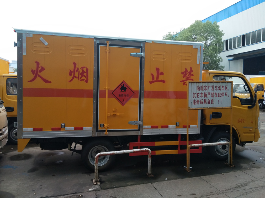 | 其他 | 该车适用于运输危险品。厢体顶部封闭,不可开启。该车用于运输独立容器包装的易燃气体:液化石油气,原油气,压缩天然气,乙炔,甲烷,乙烷,丙烷,丁烷,丙烯,丁烯,二甲醚,硫化氢,打火机或打火机加油器(装有易燃气体),压缩氢,类项号:2.1;运输具有独立容器包装的非易燃无毒气体:液化气体(非易燃,充有氮,二氧化碳或空气),压缩氧(氮,空气,氦,氩,氖),二氧化碳,类项号2.2。仅采用底盘子午线轮胎和带ABS的底盘,该车前轮安装盘式制动器,前置排气管,装配限速装置,限速80km/h。安装带有卫星定位功能的行驶记录仪 | ||