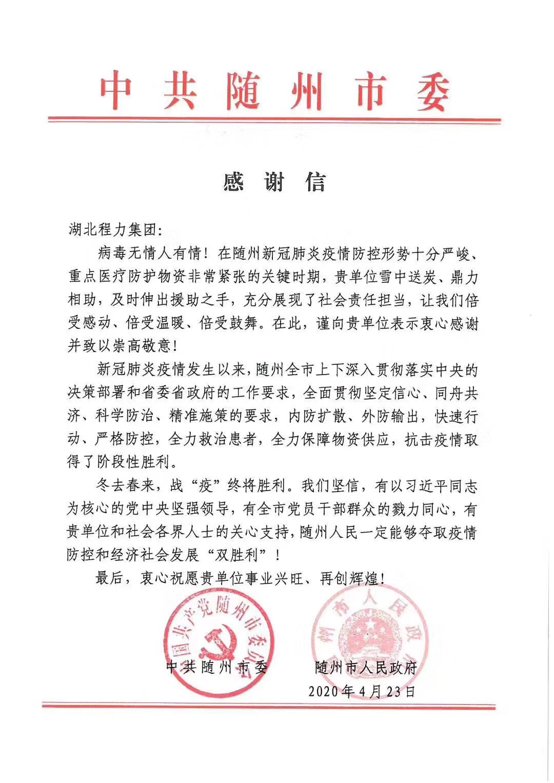 4月27日,程力公司繼國務(wù)院感謝信點(diǎn)贊鼓勵后,又收到了來(lái)自隨州市委、市政府署名的感謝信,表?yè)P程力公司在防控疫情期間的社會(huì )責任擔當,這是全體程力家人們共同的榮譽(yù),我們堅信在黨中央國務(wù)院,省委省政府,市委市政府的領(lǐng)導下,一定能夠奪取疫情防控和經(jīng)濟社會(huì )發(fā)展"雙勝利"。