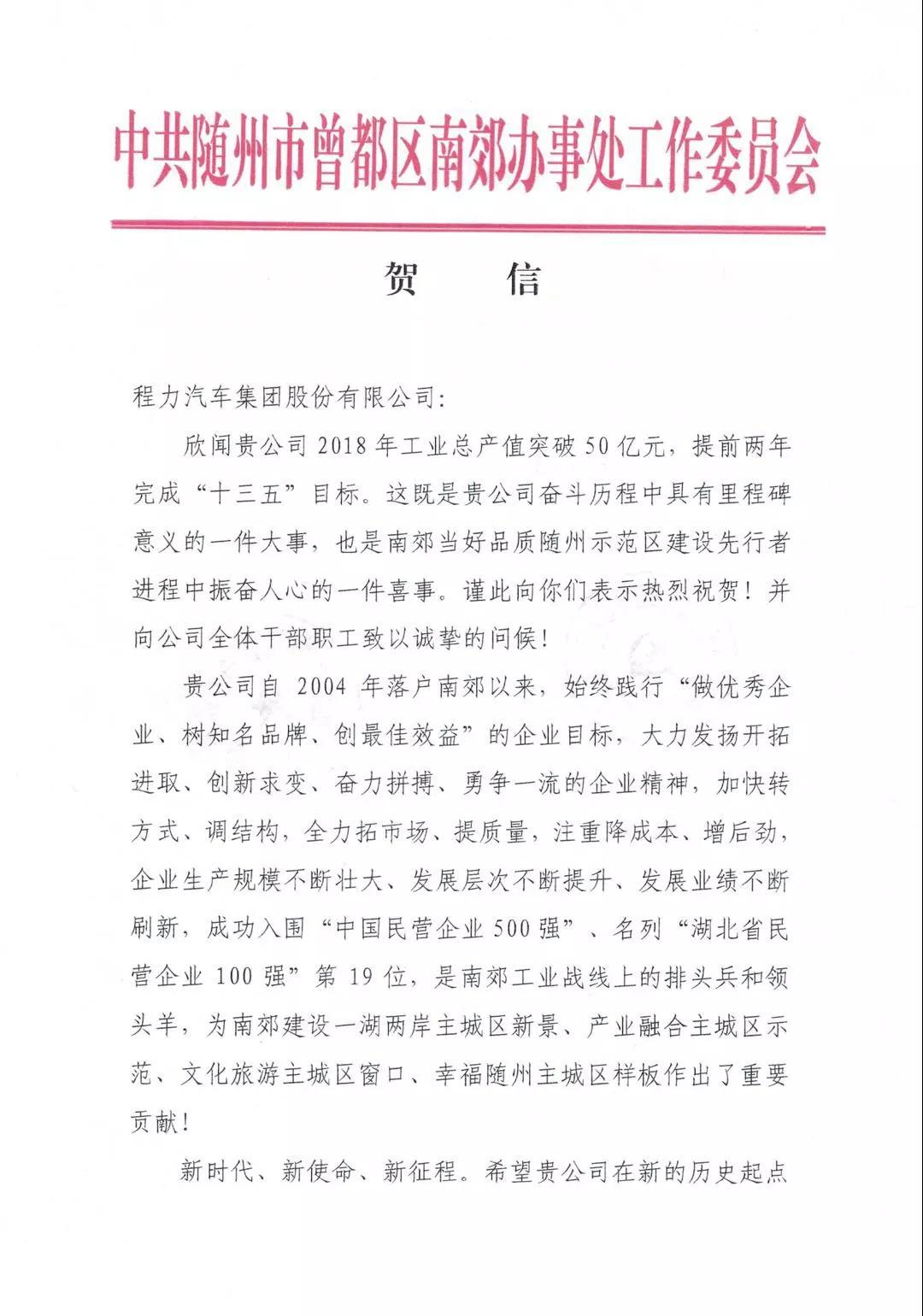 這不是一張簡(jiǎn)單的賀信,這是一份擔當和責任,更是一種智慧和實(shí)力的展現。程力專(zhuān)用汽車(chē)股份有限公司從2015不到20億元,到2017年突破36億元,程力專(zhuān)用汽車(chē)股份有限公司用2年時(shí)間基本實(shí)現產(chǎn)值翻番,而過(guò)去的2018年,程力人在新經(jīng)濟、新常態(tài)下,實(shí)現逆勢穩步增長(cháng)華麗轉身,提前2年完成了“十三五”制定的目標,確實(shí)可圈可點(diǎn),值得思索點(diǎn)贊;同時(shí),這也是一份期待已久驚喜和祝福,更是一份鞭策與鼓勵。