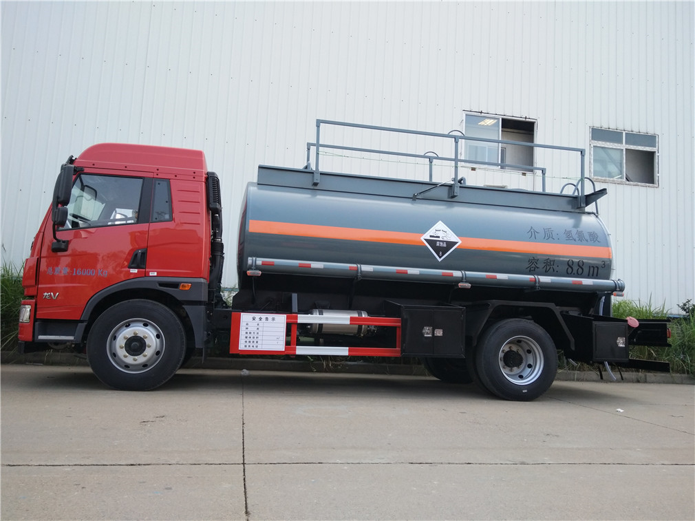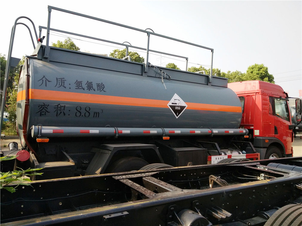 | 其他 | 该车适用于危险品运输。运输介质品名:次氯酸钠,液碱,氢氯酸,硫酸,氨水,密度分别为:1050千克/立方米,1040千克/立方米,1047千克/立方米,1045千克/立方米,990千克/立方米;类项号:8;罐体有效容积:8.8立方米,罐体外形尺寸(长×直径)(mm):5200×1600。随底盘选装平顶驾驶室。防护材料:Q235A碳钢,连接方式:左右侧面及后部防护均采用焊接连接,后部防护断面尺(mm):140×50, 后部防护离地高度(mm):450。仅采用底盘子午线轮胎型号(9.00R20 16PR,10. | ||